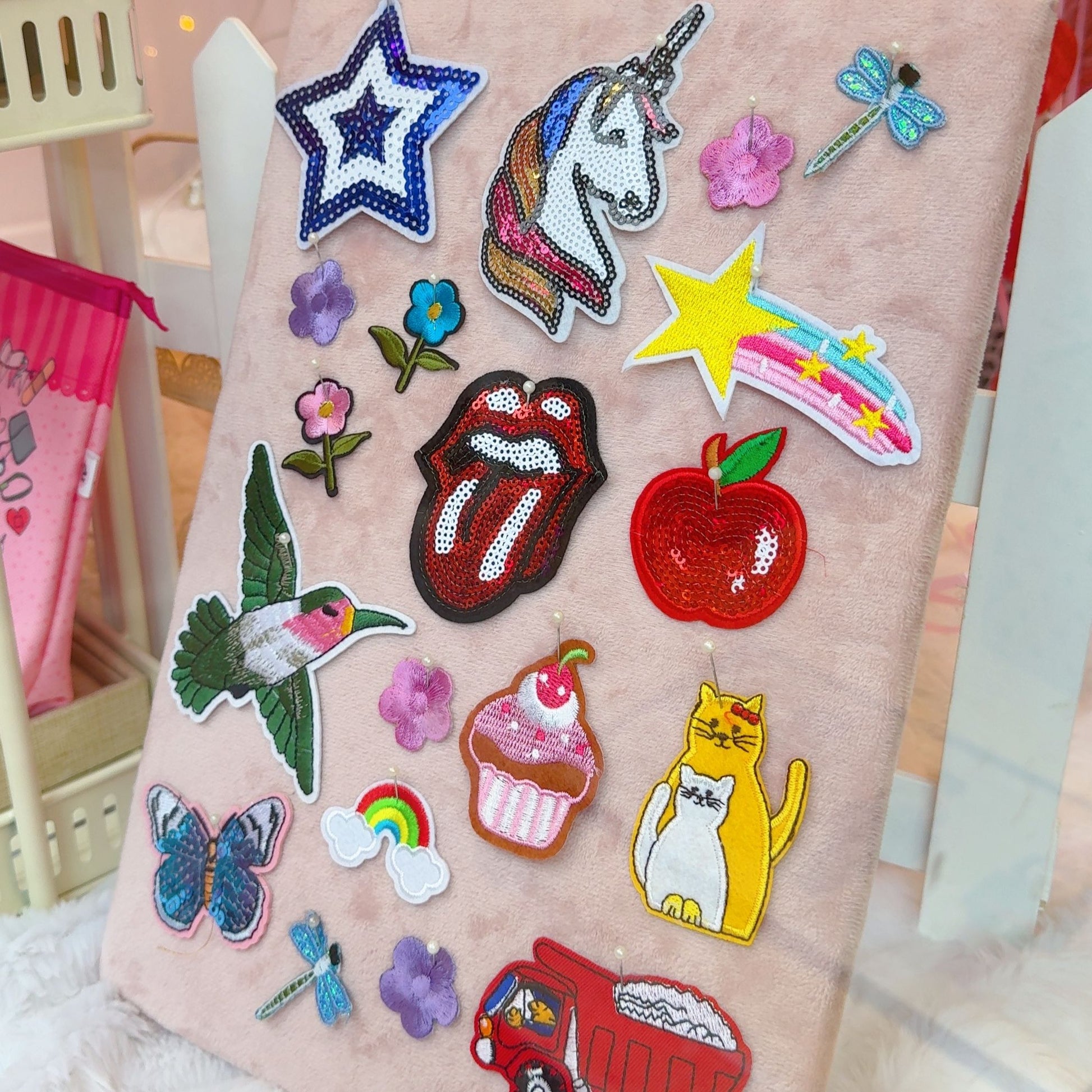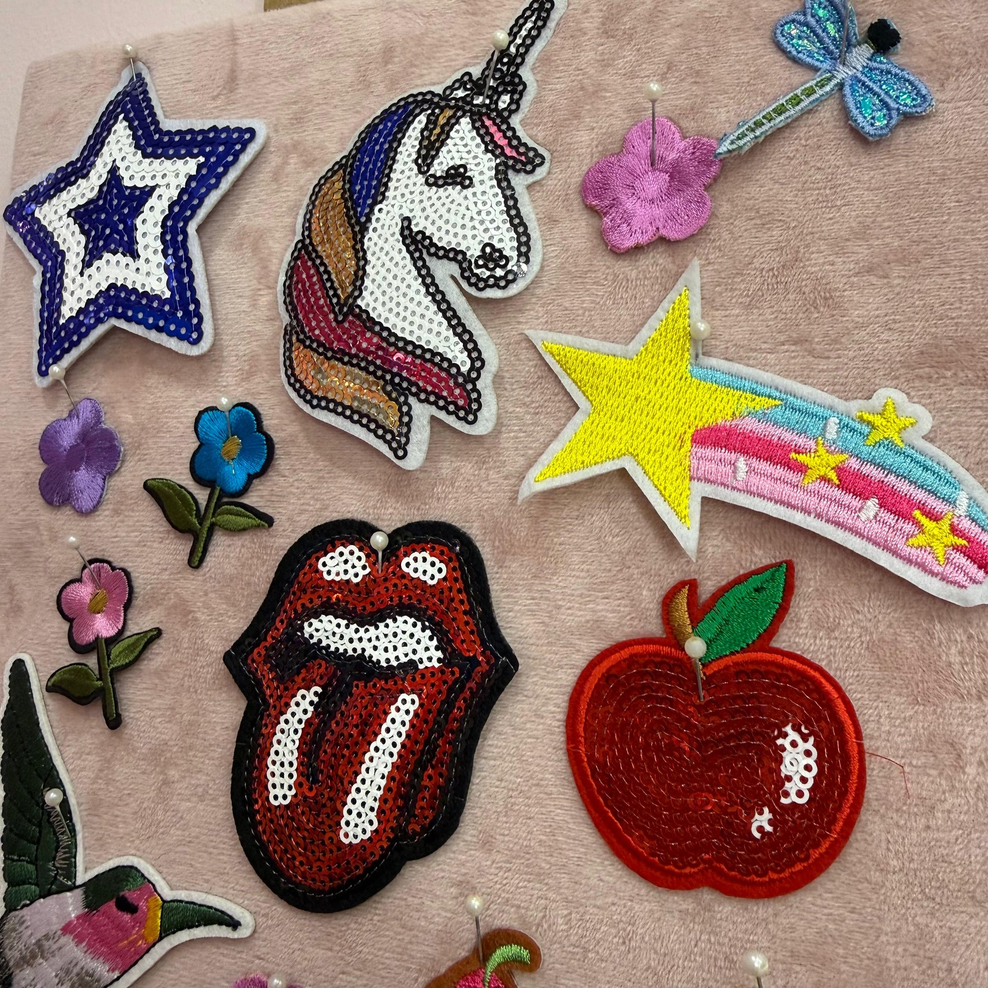 A aplicação é simples: basta usar o calor do ferro, sempre com um pano de algodão por cima, para proteger os patches — especialmente os que têm lantejolas, já que o contacto direto com o ferro pode danificar ou derreter esses detalhes.